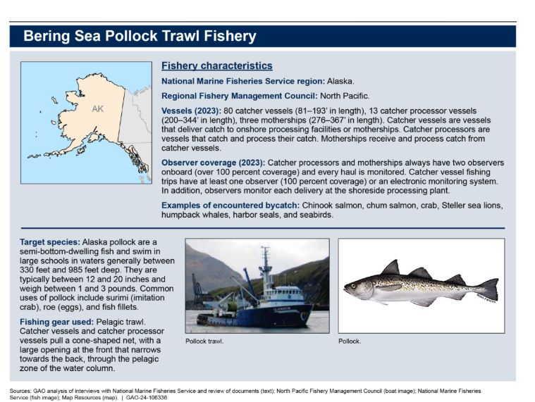 The Bering Sea pollock fishery annually includes 80 catcher vessels, 13 catcher processors and three motherships. The GAO report says, “According to NMFS officials from the Alaska region, the Bering Sea pollock trawl fishery is considered one of the most heavily monitored U.S. commercial fisheries” with at least 100% observer coverage, meaning at least one observer is present on every trip.” Because pollock is such a high-volume fishery, “for most bycatch species, observers collect data by taking samples from each haul and NMFS officials extrapolate bycatch estimates to the total catch.”