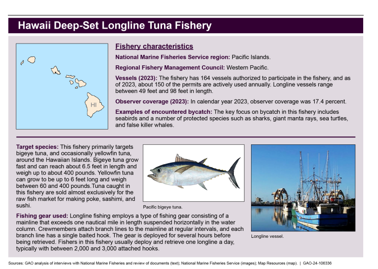 The Hawaii deep set longline tuna fishery comprises 164 permitted vessels ranging in length from 49 to 98 feet. Observer coverage in 2023 was 17.4%.