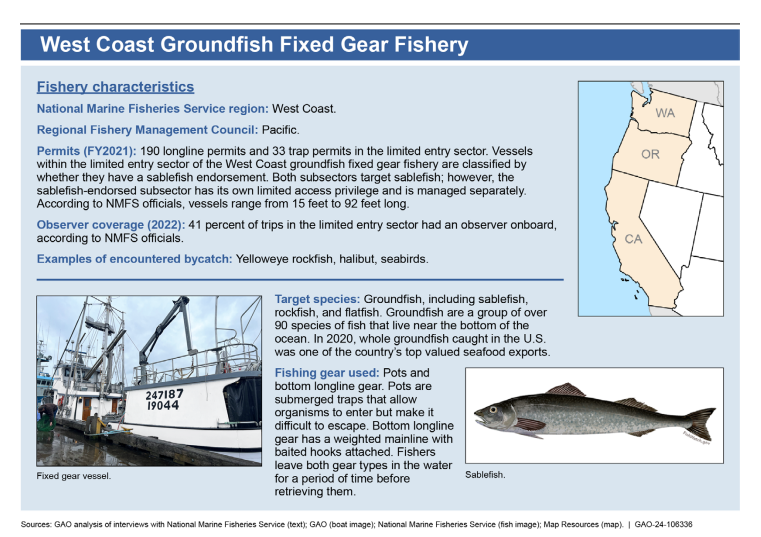 The West Coast groundfish fixed gear fishery includes 190 longline permits with vessels ranging in size from 15 to 92 feet, and 33 pot permits. Both target sablefish. Observer coverage in 2022 was 41%. NMFS officials told the GAO that “the lag between when the data are collected and estimates are published means that the information is not available for the Pacific Council to make management decisions during the fishing season,” and that as of 2023 “no electronic monitoring was used in the fishery.”
