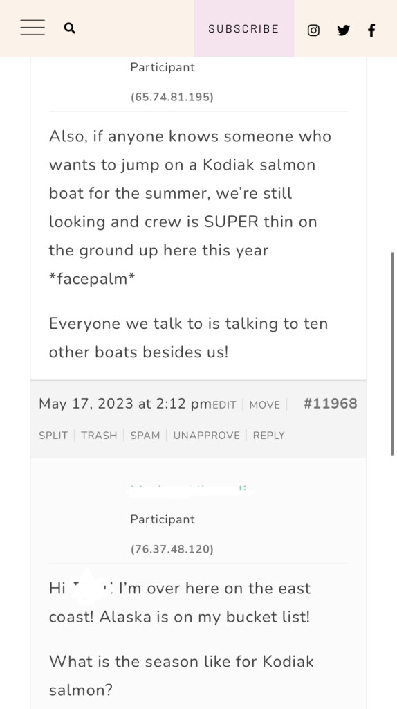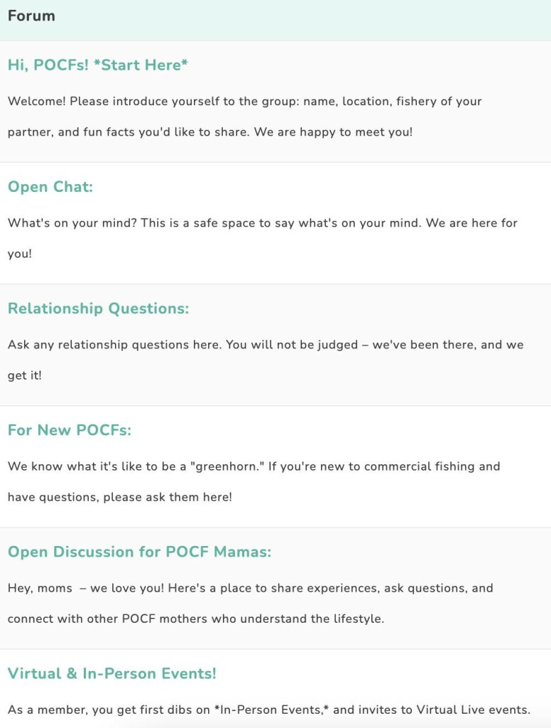 The Private Forum for Partners of Commercial Fishermen is a space to instantly connect and learn from other POCFs, relate, ask questions, and chat with others around the world with shared experiences that only people in this lifestyle understand.