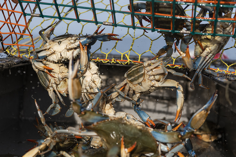 When the tide slowed, crabbing began, and it was obvious Kenny and crew were seasoned watermen. When potting, Kenny steered the boat, used a handheld gaff to hook the rope and buoy, placed the rope into the pot hauler, and then engaged the hauler by using his good foot to work the floor foot pedal.