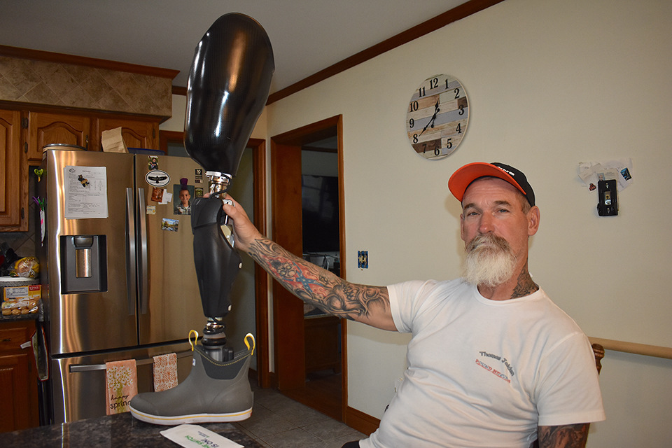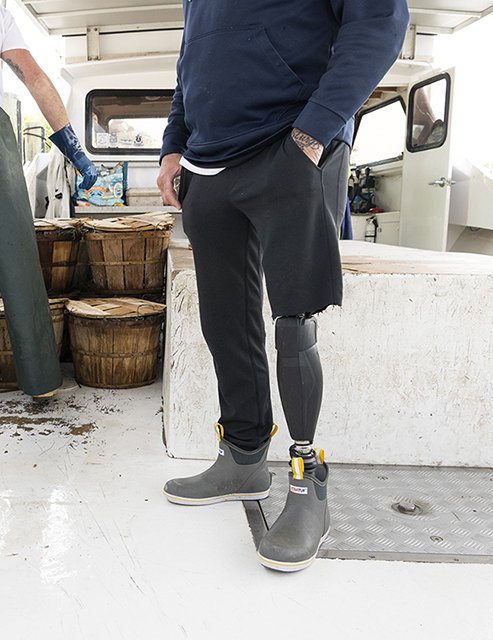 When working pots at the outside helmsman station, he stands all day with his leg in a locked mode position. “I tried it both ways but I found that the lock mode keeps the knee from bending and allows me to stay steady on my feet,” he says.