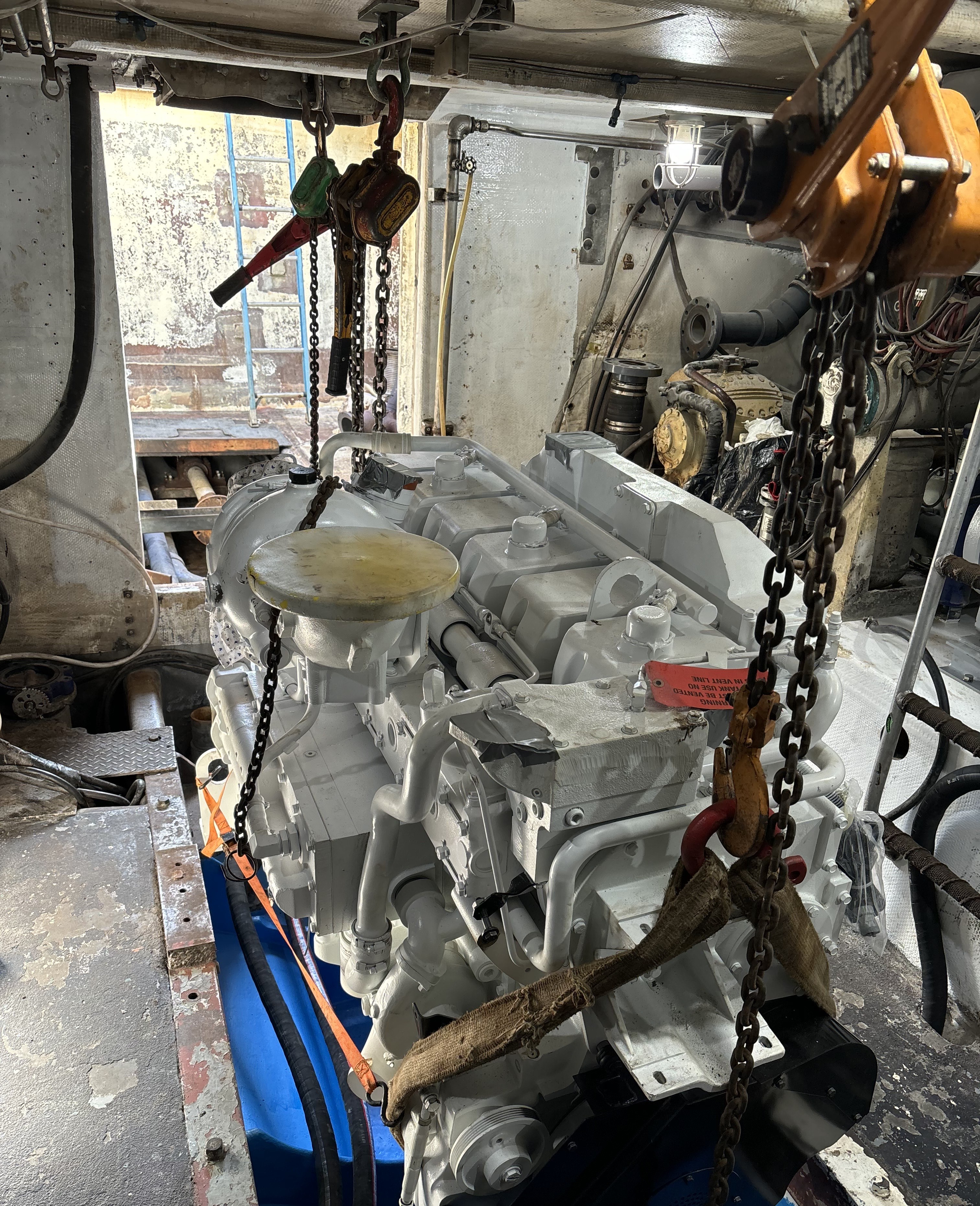 According to crew member and videographer Brooke Cottrell, Melling repowered the 70-foot vessel in 2024. “He had a 3412 CAT, and he took amazing care of it. Kris changed the oil every 300 hours, everything,” says Cottrell. “Last year, he put in a 625-hp, Cummins KT19.” The Cummins turns a Twin Disc MG516 with a 6:1 reduction to the shat and propeller.”