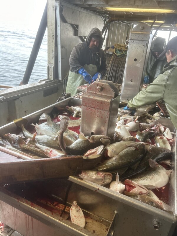 There’s so much cod now that Payne, who usually takes a crew of six or seven men, will take as many as nine for cod fishing. “We’re taking good care of the fish, and you have to have three guys gutting all the time,” he says. “We bring the fish aboard, cut the gills and put’m in a tank to bleed. Then the bottom of the tank rises up and the fish go into another tank where they gut’m. Then the bottom of that one raises up, and they go into a wash, and then we send them down into the hold into big blue tubs full of slush ice and brine."