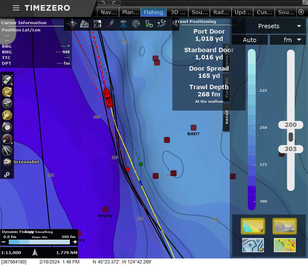 According to Parrott, TimeZero trawl positioning software takes the information from the Notus sensors and renders an image on the TZ chart by calculating currents and other factors. “We tested it with Riley Holt on the Mandy J. out of Newport, Oregon, bottom trawling, and he was quite pleased with it,” says Parrott. “It showed the trawl right where he thought it was.”