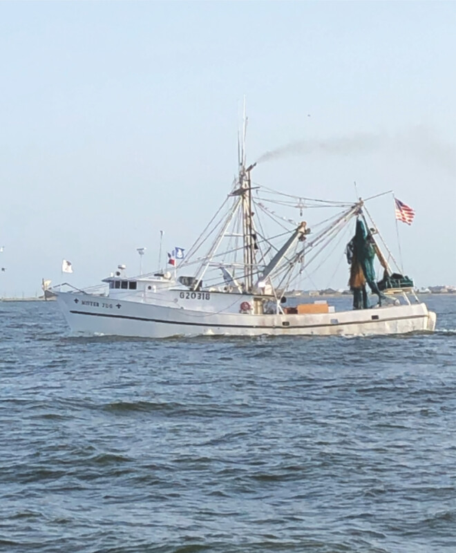 “The sounder actually sees activity on bottom,” he says. “If we see some activity, we’ll slow down and make a little sample try with a small net.” Dufrene catches mostly white shrimp and brown shrimp, landing anywhere from 40,000 to 60,000 pounds per trip.