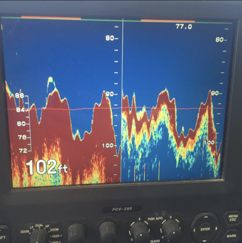 “Even at 1.28 milliseconds, you still have like a 4-inch dead zone, so two fish or even three can mark as one fish. So what you see as a 42-centimeter fish could be two 30-centimeter fish overlapping. It’s really most accurate when we are targeting Pacific ocean perch, or Atka mackerel. But I rely on that one more than any other.” Durnan’s ES80 can send pulses between 200 and 50 kHz, or lower, and he monitors each frequency on its own screen.