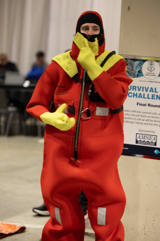 The final event is both the most entertaining to watch and the most relevant to mariners: donning a survival suit. Contestants dump their suits from drybags and race to get fully zipped with the Velcro mouth flap secured.