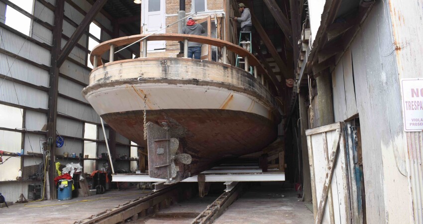 Cockrell’s Marine Railway is one of a few covered railways on the Chesapeake Bay large enough to haul the Suzanne, and it struggled to get her up on the rails.