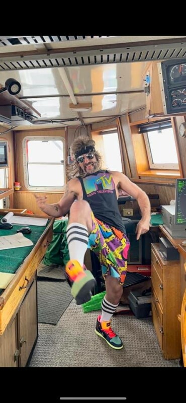 “We fish hake, out of Westport and then go up north for the A and B seasons,” says Connor. He takes essentials like his Red Ledge jacket and Xtratuf books. “After that it’s all about comfort,” he says. “Slippers, board shorts, hats. Then I heard all these old timers talking about how great it was in the 80s,” says the 35-year-old Connor. “So I decided to bring the 80s back. I ordered all this stuff and the Golden Alaska would bring packages out to me. It took a couple of weeks to put together, but then one day I came out on deck with my ’80s outfit.”