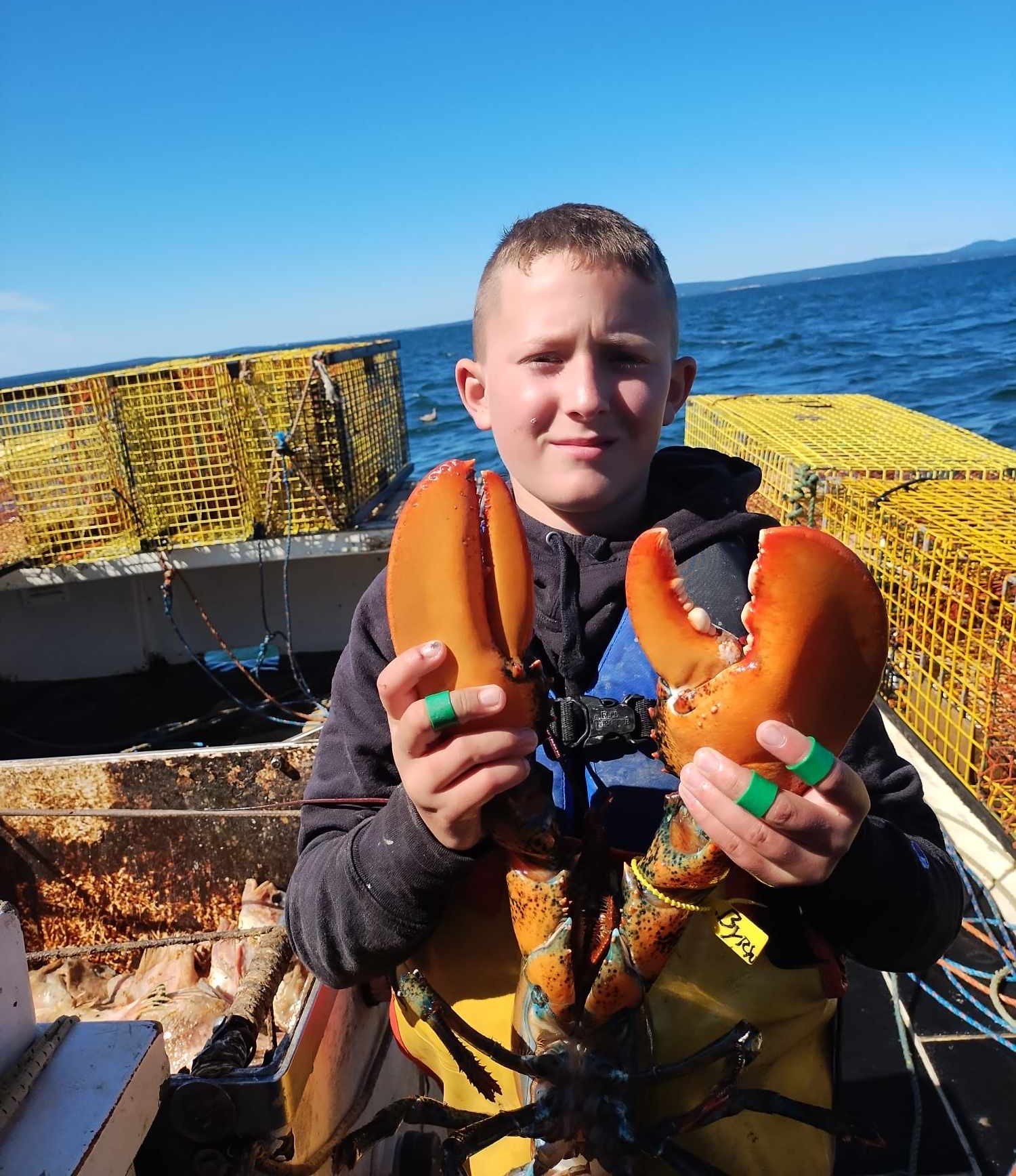 11-year-old Byron lobstering with his grandfather aboard Molly Ryan on Penobscot Bay in Maine, the day before school started. He brought a lobster sandwich to school for lunch. Photo submitted by Tess Haskell