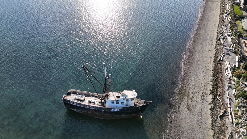 A derelict commercial fishing vessel has run aground in the north section of Miller Bay near Indianola, Wash., after breaking free from its anchor, according to the Suquamish Police Department (SPD).