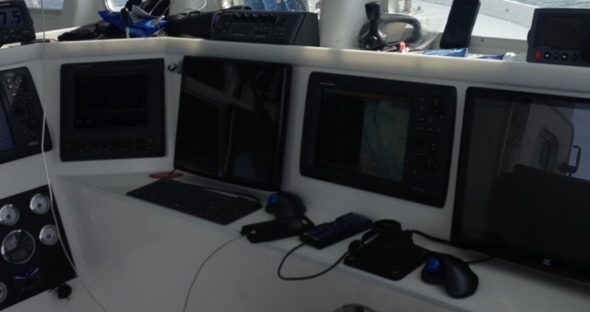 For auxiliary power, the Pacific Bully has two 21kW gensets made by a Florida company, Southeastern Power Products. “They have Phasor generators and Kubota engines,” says Wetle. “We can run one or the other, or together depending on the loads. Or we can shut them both down and run on the alternator. We’ve got four panels, 110, 220, 12-volt DC, and 24-volt DC.” Among other things the gensets run a 20-ton refrigerated seawater system that Wetle had custom build using components like those in IMS systems. “They’re all electric with a diagnostic system that tells me what’s wrong if something goes wrong, so the mechanic comes. I can tell him what the problem is.”