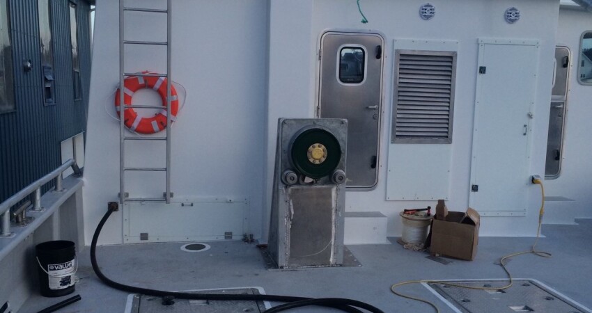 The load, when tanked, put a strain on the fiberglass boat and Wetle and gussets in all the areas that held water. “We had to reinforce everything and add hatch walls so the deck wouldn’t flex,” he says. “And when we got to California, we found we were over the tonnage for our permit; we had to add some bulkheads and tonnage frames, which helped stiffen the hull.” Wetle points out that the boat is very stable- the wheelhouse is made of Nidacore, “It’s heavy below and like a feather on top,” he says.