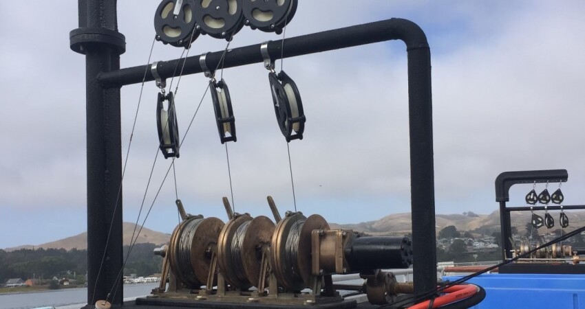 “There was a guy near Yarmouth, Vince Stuart, who has since passed away. The company was Clare Machine Works. They did incredible work. We have our 17-inch longline hauler on the opposite side of the boat, so if we get a big tangle, we can deal with it on deck rather than hanging over the side, and there’s a line coiler there. We have a crab block for when we’re crabbing, salmon gurdies.”