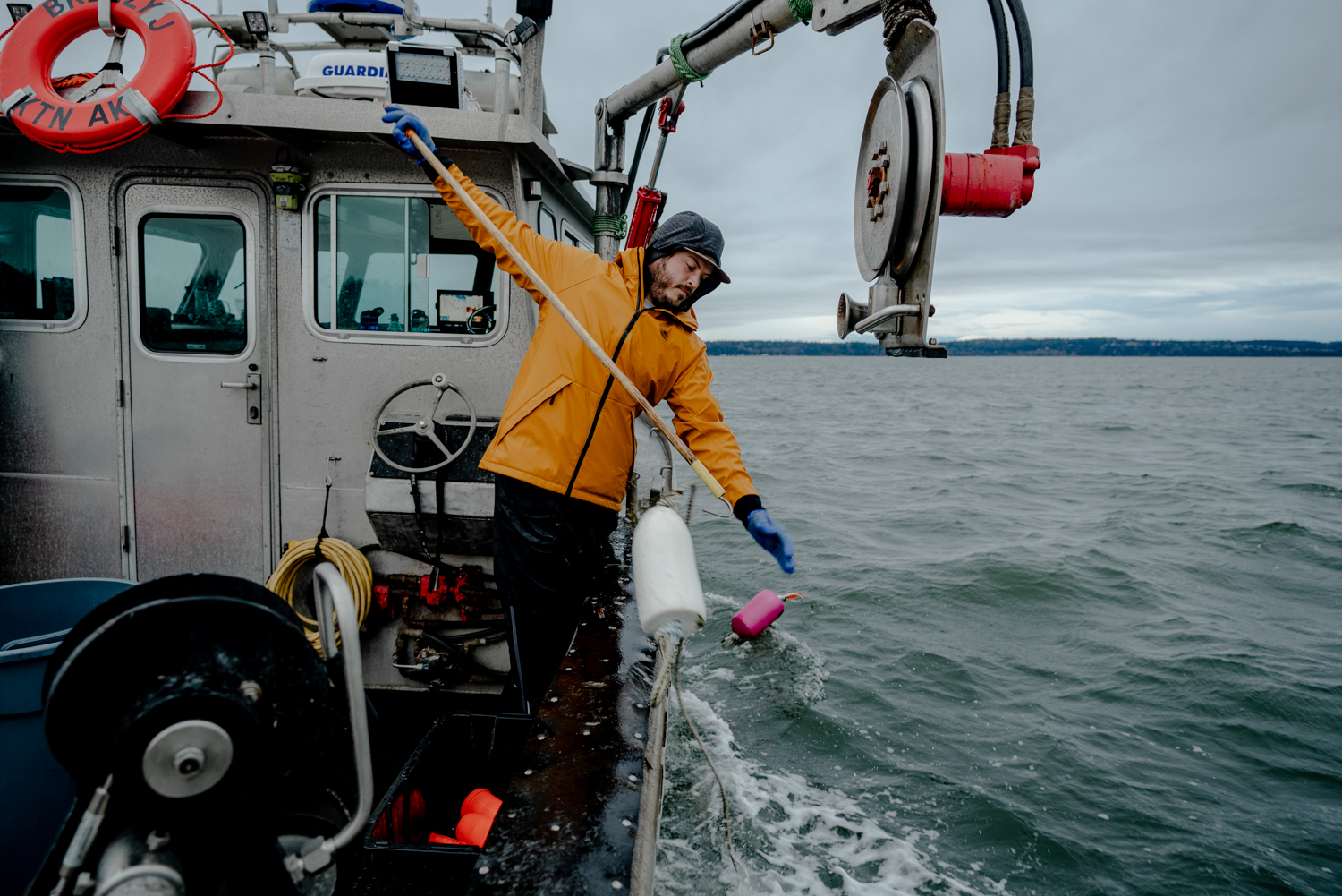 I loved being on the boat before dawn. The first cup of coffee on deck by myself, as the sky brightened from black to purple, is so deeply ingrained in my memories. The cold, salty breeze revived my soul every morning as I painted the landscape of Anacortes in my mind. While Sean drove the boat out of the harbor, I chopped up bait; a task I would normally despise but found myself enjoying as part of the morning routine (minus the occasional salty bit in the mouth). There was satisfaction in the repetition of the task that helped me get the sleep out of my eyes and the bite of the cold wind made me alert and ready to go. Breakfast sandwiches in the diesel stove would eventually waft through the small house of our 34ft boat and I would join Sean inside for the rest of the steam out to our first string of pots. I would watch him as he studied the navigation system, lit only by the computer screens. I could see him planning for the day thinking about which pots to haul first and where to set back. This was the first time I had ever seen him as a captain on the fishing grounds and it was then that I understood his love for being on the water. After a while he would give me a 10 minute warning signaling it was time for me to get out of my slippers and into my rain gear and XTRATUF’S.
