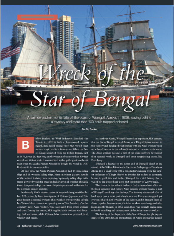 Also in the tradition of the Journal, you’ll find Alaska fisherman Gig Decker’s feature on the wreck of the Star of Bengal, a turn-of-the-last-century salmon packer that met its fate on the rocks off Wrangell in Southeast Alaska. Decker has been fascinated by this story for years, and I’m very excited to bring his words and findings to this issue.