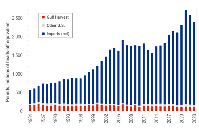 Originally, imported shrimp were primarily wild-caught abroad. Over time, farm-raised shrimp produced through expanding aquaculture operations in developing countries became the dominant source. By 2023, shrimp harvested from the Gulf accounted for only 4.5% of the U.S. market, compared with 28.7% in 1984.