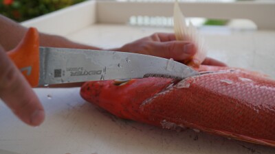 “I run the outdoors department,” says Abissi. “Our newest knife is the Dextreme. It has a double edge – a long cutting edge and then a scalloped edge on top. So you can use the scalloped edge to cut through scales and collars and save the good edge for filleting.” Originally developed for red snapper fishermen, Abissi developed a 12-inch version of the Dextreme for tuna fishermen.