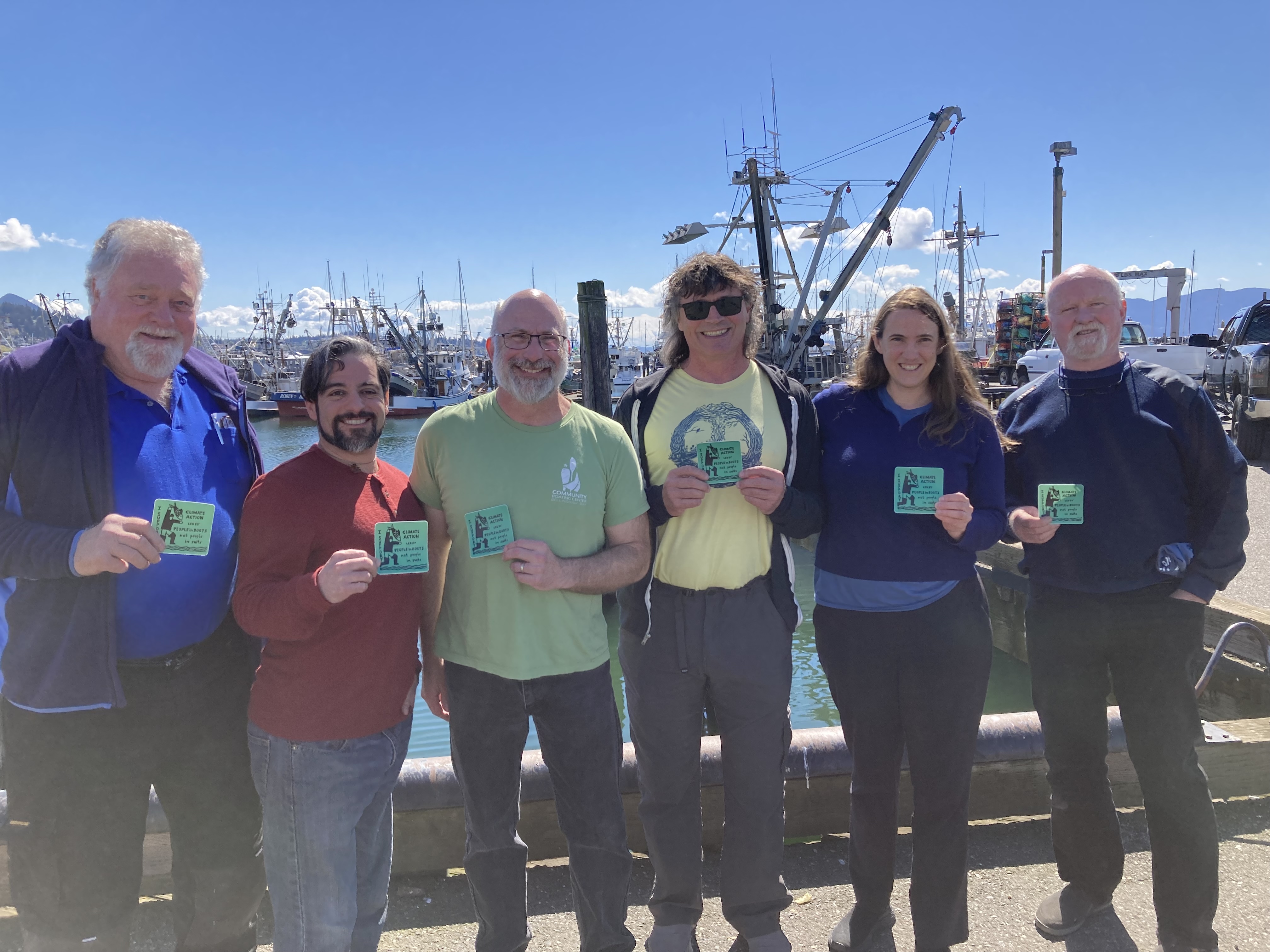 The author poses with Bellingham fishermen following a low-carbon fishing fleet workshop hosted by the Working Waterfront Coalition of Whatcom County and Fishery Friendly Climate Action Campaign in April 2024, holding stickers bearing the Campaign’s slogan. Photo by Sarah Schumann