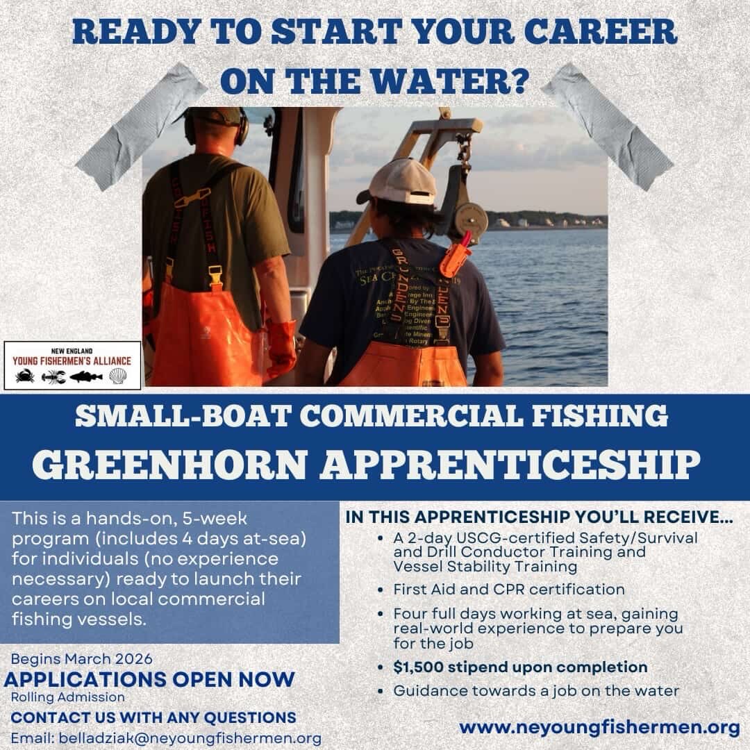 Our goal is to ensure the next generation of fishermen are skilled, knowledgeable, and ready to carry on this New England industry,” said Andrea Tomlinson, executive director of NEYFA. “This apprenticeship provides hands-on learning, mentorship, and a pathway to meaningful careers on the water.”