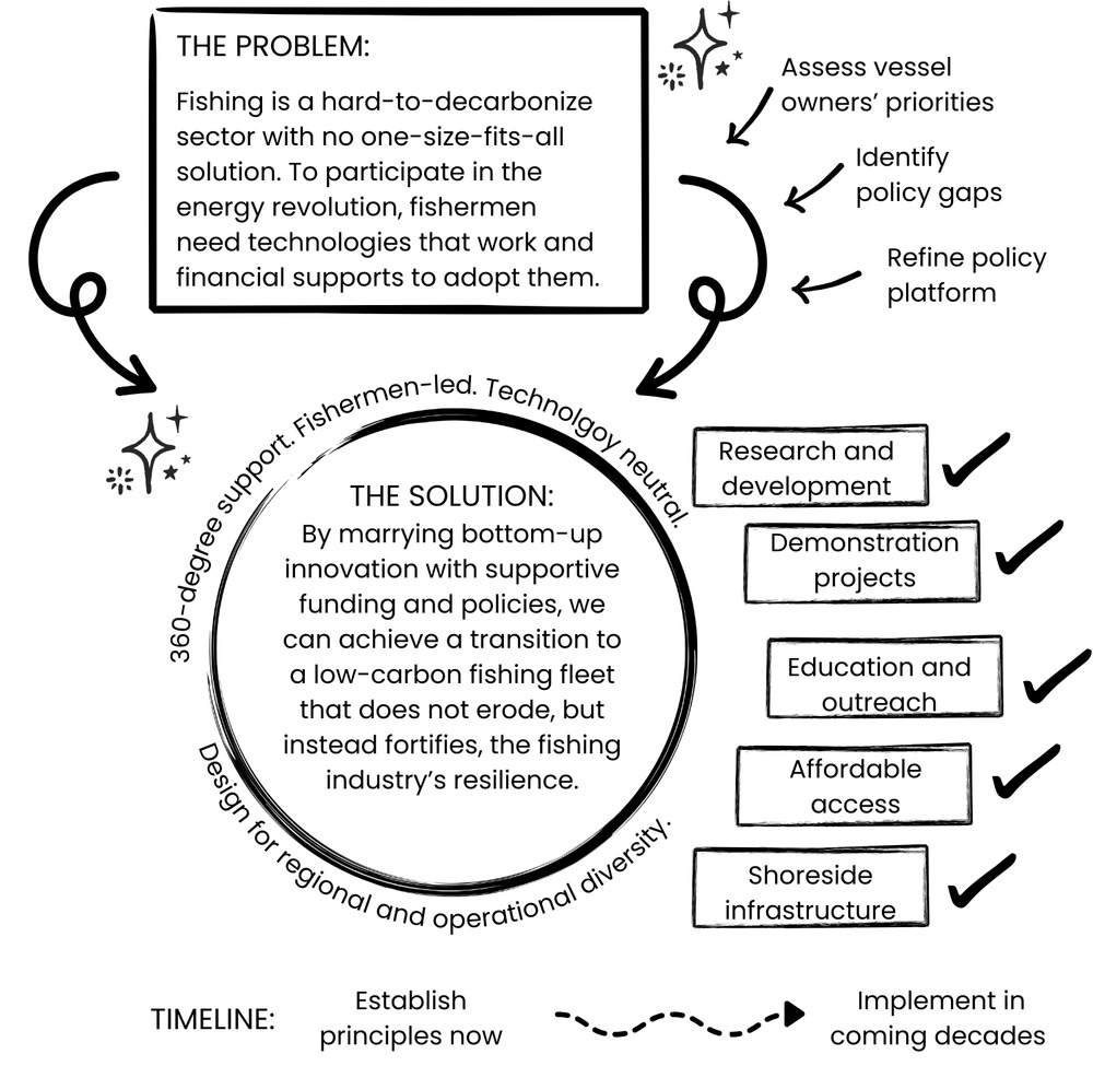 In the two years since, five researchers with roots in the fishing community set out to fill this gap by establishing an evidence-based framework for fishing industry-led advocacy aimed towards achieving a low carbon fishing fleet. Drawing from interviews with almost 150 fishermen and over 30 supporting experts, the resulting 18-volume set synthesizes thousands of insights on the promises and pitfalls of various policy and technology pathways to a low carbon fishing fleet, thereby equipping fishermen and their partners in government and beyond with the knowledge to pursue a safe, affordable, equitable, and practical low carbon transition that puts the fishing industry at the helm of its own energy future and secures its continued contribution to American diets and coastal economies.