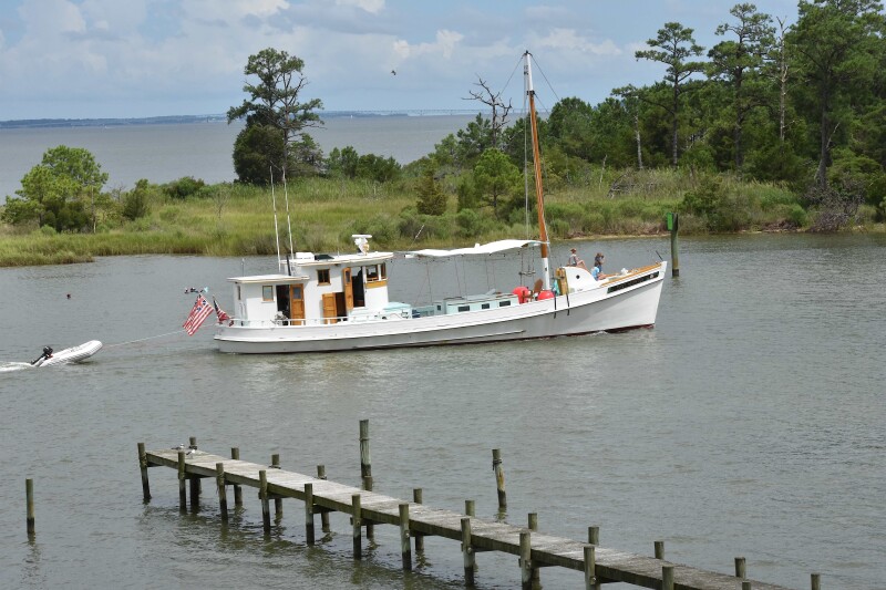 Perhaps the most noted of the birthday boats is the Nellie Crockett. The 61.7’ x 20.4’ x 6.5’ vessel was built by Charles A. Dana in Crisfield, Md., in 1925, and was named to the National Historic Landmark Register in 1994. She was originally built for Andrew A. “Shad” Crockett of Tangier Island to work as an oyster buyboat and was conscripted in World War II by the War Shipping Administration. After the war, she went back to work as a commercial fishing boat and was worked into the 1990s in Virginia’s oyster replenishment program planting seed and shell. Ted and Mimi Parish of Georgetown Md., own the boat today and use her as a cruising yacht. The Parishes, however, have maintained her original physical workboat appearance.