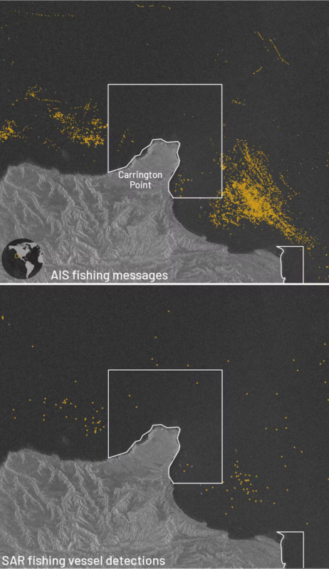 Synthetic aperture radar still has limits – primarily difficulty detecting small boats and less frequent coverage than AIS – but it’s still a leap forward. In one study of coastal areas using both technologies, we found in about 75% of instances fishing vessels detected by synthetic aperture radar were not being tracked by AIS.