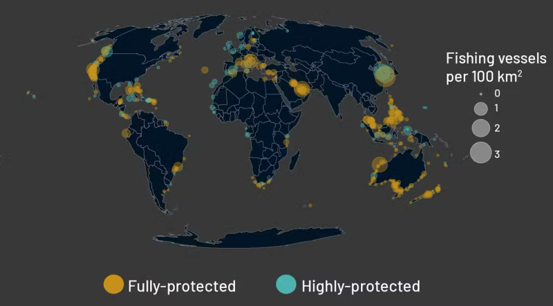 The second study uses the same AIS and synthetic aperture radar data to examine a broader set of marine protected areas – including many that explicitly allow fishing. They document substantial fishing activity in these areas, with about eight times more detections than in the protected areas that ban industrial fishing.