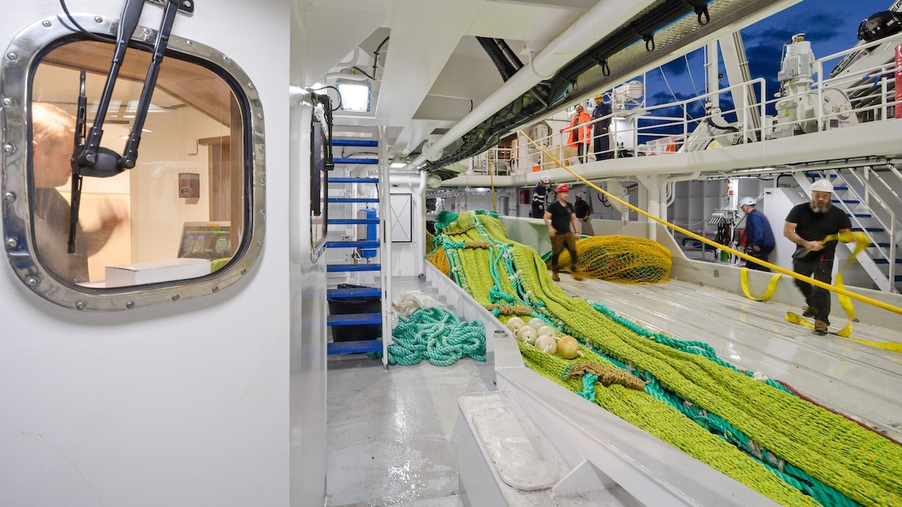 For fresh catch processing, the Hulda Björnsdóttir boasts a high-capacity system outfitted by Micro, including an over 44,000-pound icemaker from Climafrio and semi-automated tub handling. The fish room also features a remotely controlled cargo crane supplied by Crane Solutions for handling 264-gallon tubs.
