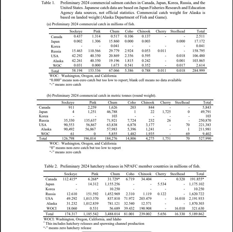 The total North American commercial salmon catch of 227,227 metric tons in 2024 (just under 500 million fish) was a decrease from 2023, which was expected given the odd/even year patterns in pink runs. However, it was the lowest pink salmon catch since 1976 in terms of weight.