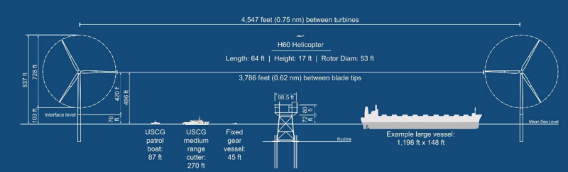 The wind power industry is looking to taller, more powerful turbines in excess of 800 feet above sea level and 14 MW output. The potential extent of radar shadows cast by those turbines – obscuring radar images of smaller vessels – is concerning to the maritime community, from commercial fishermen to deep-draft vessel operators worried about spotting smaller vessels when they exit wind turbine fields close to traffic separation lanes outside major ports like the New York-New Jersey Harbor complex.