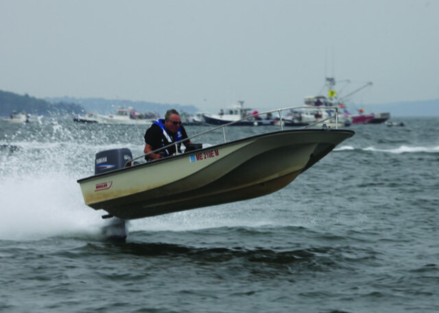 But the weather “was pretty good, a little windy and one to two-foot waves. That’s not bad,” said Jon Johansen, the scorer for the Maine lobster boat races. “It doesn’t affect the speed because you’re going with it. Helps a little bit.” He noted that the chop wasn’t too bad for the smaller boats either, “though now and then a skiff might be launched completely out of the water, except for maybe its prop.”