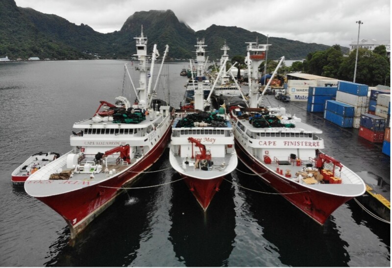 Three Cape Fisheries purse seine vessels wait their turn alongside the container dock to unload at the StarKist cannery in American Samoa. These vessels can now fish in US waters near Jarvis, Wake, and Johnston islands without foreign competition. Cape Fi