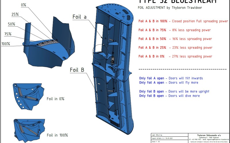 “For the last seven years, we have been testing a system that is now fully functional,” says Henrik Andreassen, area sales manager at Thyborøn Trawldoors of Thyborøn, Denmark. “We started in 2002 with doors where you adjust the foils manually with bolts, and the foils could be open or closed. Then, in 2017, we introduced doors with a hydraulic ram on the foils, and you could hook onto it and pump fluid in to open the foil or take fluid out to fine tune their performance.”