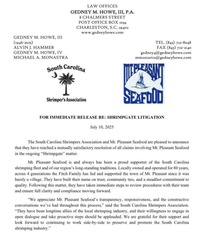 “We appreciate Mt. Pleasant Seafood’s transparency, responsiveness and constructive conversations we’ve had throughout this process,” the South Carolina Shrimpers Association said in a statement issued July 10 through its lawyer Howe.