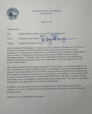 “Our government should never sell out American fishermen to foreign green energy companies. NEFSA applauds Secretary Burgum for pressing pause on the Empire Wind project, which regulators rushed to approve over the objections of working commercial fishermen and their families," said Leeman. "We hope and expect the new administration will end the era of special treatment for foreign developers industrializing America’s fisheries.”