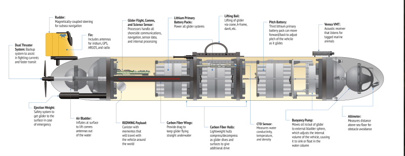 The vehicle’s name Redwing is an acronym for “Research and Education Doug Webb Inter-National Glider,” recognizing Rutgers’ scarlet school colors and memorializing inventor Webb, who founded Webb Research, the predecessor organization that became Teledyne Marine. WHOI now operates the second largest glider fleet in the world, conducting climate research and supporting protection of endangered species such as the North Atlantic right whale.
