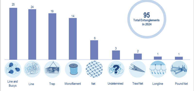 The increase in entanglements follows efforts by NOAA and commercial fishermen to reduce entanglement risk, particularly in lobster, crab and fish trap fisheries.