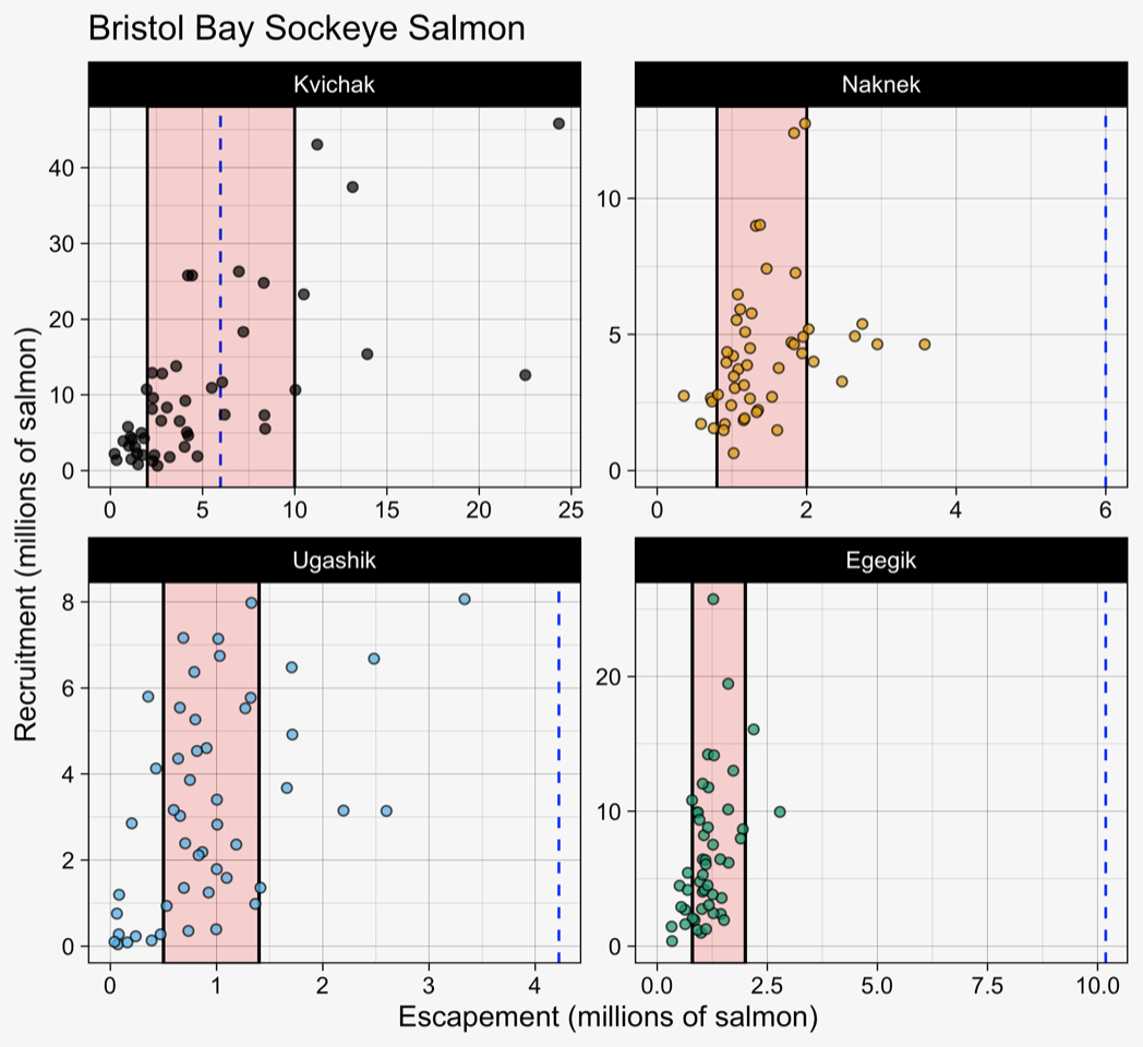 Figure 1. Relationship between the number of fish in the escapement (spawning abundance) and the resulting recruitment or number of fish that are produced as successful offspring, from that spawning event. Shown are data from 1963 to 2019 (through brood year 2011) for Bristol Bay’s Kvichak, Naknek, Ugashik and Egegik rivers. The current escapement goal ranges are shown as the vertical red stripe in each panel, and the UW preseason forecast for 2020 is noted by the vertical blue dashed line in each panel. Each data point shows escapement in a single year and the corresponding recruitment of fish produced from that spawning event. Data provided by the Alaska Department of Fish & Game.